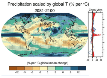 Lo que está claro es que el cambio climático va a modificar los patrones de lluvia. Podríamos pensar que un planeta más cálido traerá desertificación general, pero no: las zonas lluviosas tienden a ser más lluviosas y las secas más secas. Os lo enseño en un gráfico adaptado del IPCC en el que se muestra cómo podría cambiar el porcentaje de precipitación para final de siglo por cada ºC que suba la temperatura.