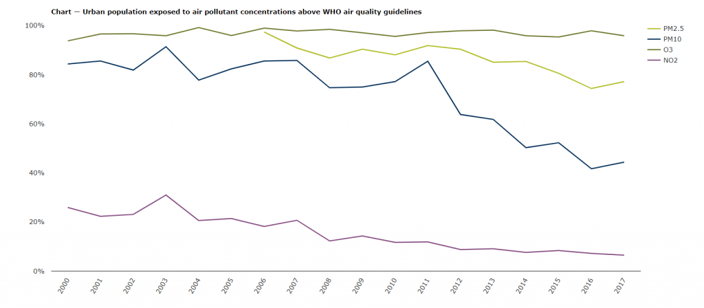 Con esa información, nos pueden venir a la mente imágenes de lugares típicamente contaminados, por ejemplo, en Asía… ¿verdad? Pues aquí os presento un gráfico de la población urbana europea expuesta a concentraciones de aire contaminado por encima de los límites establecidos por la Organización Mundial de la Salud.