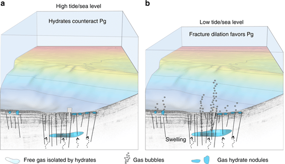 ¿Por qué? Con la marea baja, se fomenta la apertura de fracturas en los sedimentos que favorecen que el gas se escape, mientras que con las mareas altas, el sistema se encuentra más equilibrado.