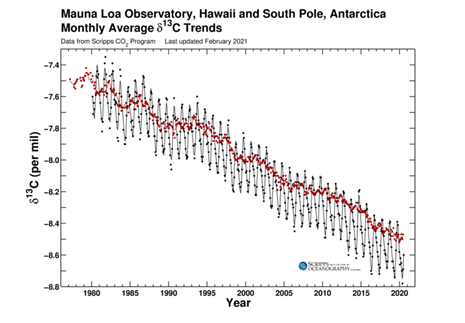 Esta proporción entre carbono 12 y 13 es parecida en la atmósfera y los océanos, pero no en las plantas, que tienen muchísimo menos carbono 13. Si los combustibles fósiles vienen sobre todo de plantas muy antiguas, en la atmósfera tendría que bajar la proporción de carbono 13… Vaya, pues otra pista que apunta hacia los combustibles fósiles y, por tanto, hacia nuestras acciones para explicar lo que estamos observando.